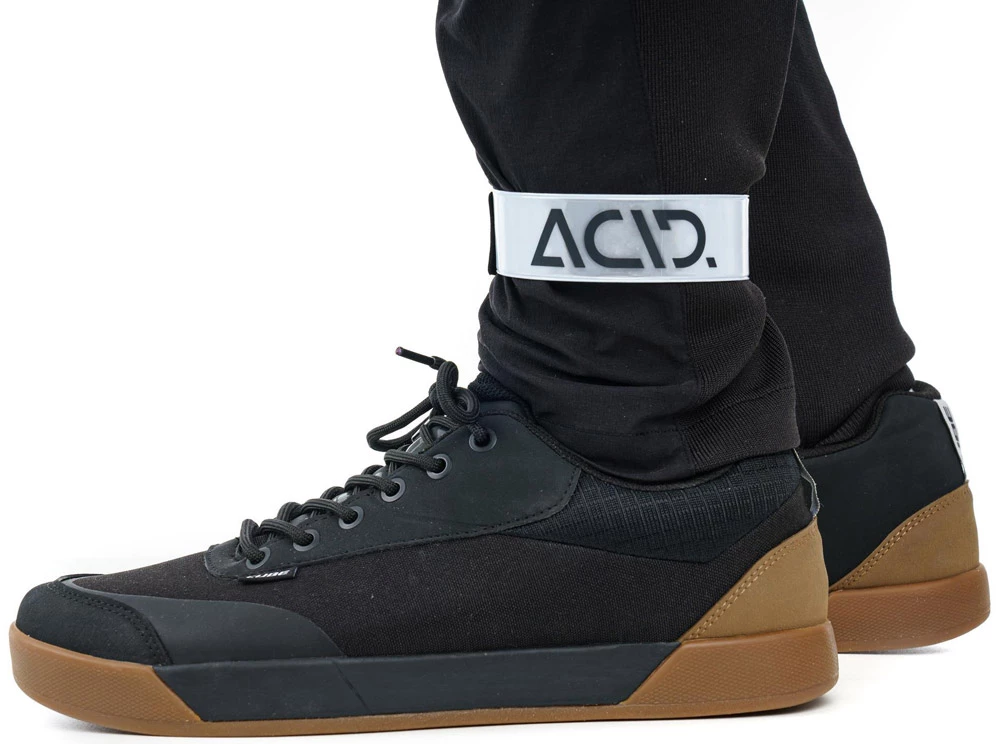 La bande réfléchissante ACID Snap empêche le pantalon de s’emmêler dans la chaîne et vous permet d’être mieux vu dans l’obscurité.