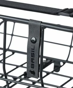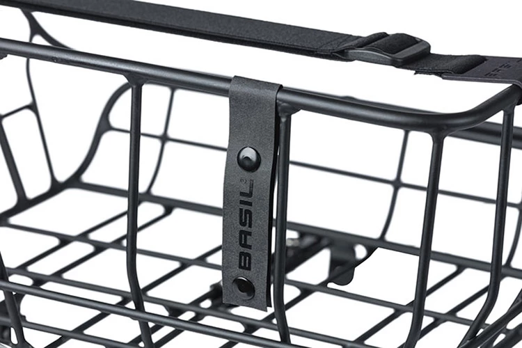 - Le panier frontal Basil Portland est Ă©quipĂ© d’une sangle de fixation rĂ©glable