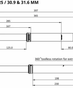 Le DIVINE est Ă©galement dotĂ© d’un dĂ©battement maximal rĂ©ductible. En utilisant les entretoises fournies, vous pouvez rĂ©duire le dĂ©battement en interne par incrĂ©ments de 5 mm. De plus, il possède un pied rotatif qui peut ĂŞtre tournĂ© manuellement pour fournir encore plus de profondeur d’insertion et Ă©viter les points d’appui dans le tube de selle.