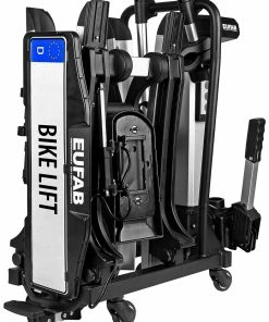 Le Bike Lift d’Eufab est un porte-vélos robuste et stable, conçu pour transporter jusqu’à deux vélos. Il est équipé d’une fermeture rapide et d’un mécanisme de rabattement qui peut être actionné par une pédale. Un entraînement électrique sert à abaisser et à soulever le porte-vélos. Convient aux vélos avec cadre « oversize » et cadre en Y jusqu’à ø 6 cm.