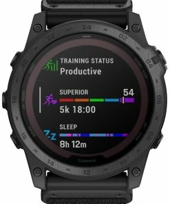 Boîtier robuste de 51 mm testé selon la norme militaire MIL STD 810G, avec verre saphir résistant aux rayures et écran de 1,4″. Lunette en titane noir avec revêtement DLC et dos du boîtier en titane avec revêtement PVD. Variantes PRO avec bracelet en nylon noir avec coutures renforcées.