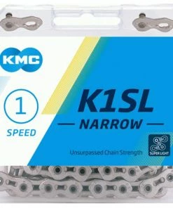 La chaîne singlespeed KMC K1SL Narrow avec surface nickelée pour BMX, système de moyeu à vitesses intégrées et autres systèmes singlespeed nécessitant une transmission directe de la puissance.
