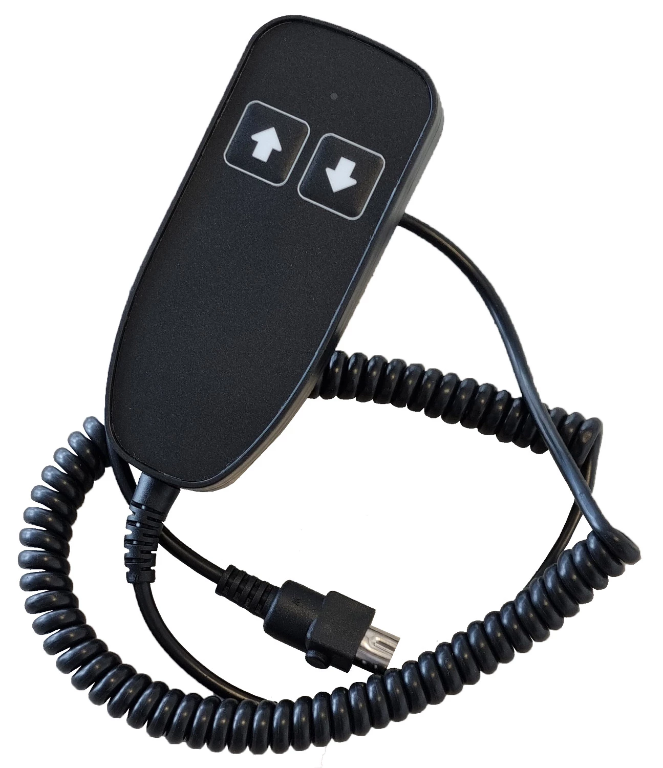 La tĂ©lĂ©commande Nuton pratique avec une longueur de câble gĂ©nĂ©reuse de 1,5 m Ă 2,8 m pour le pied de montage Ă©lectrique. Commande manuelle par bouton-poussoir de montĂ©e/descente et avec languette d’accrochage.