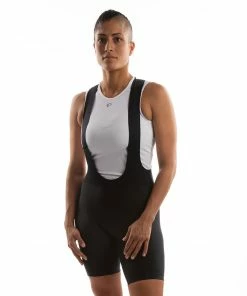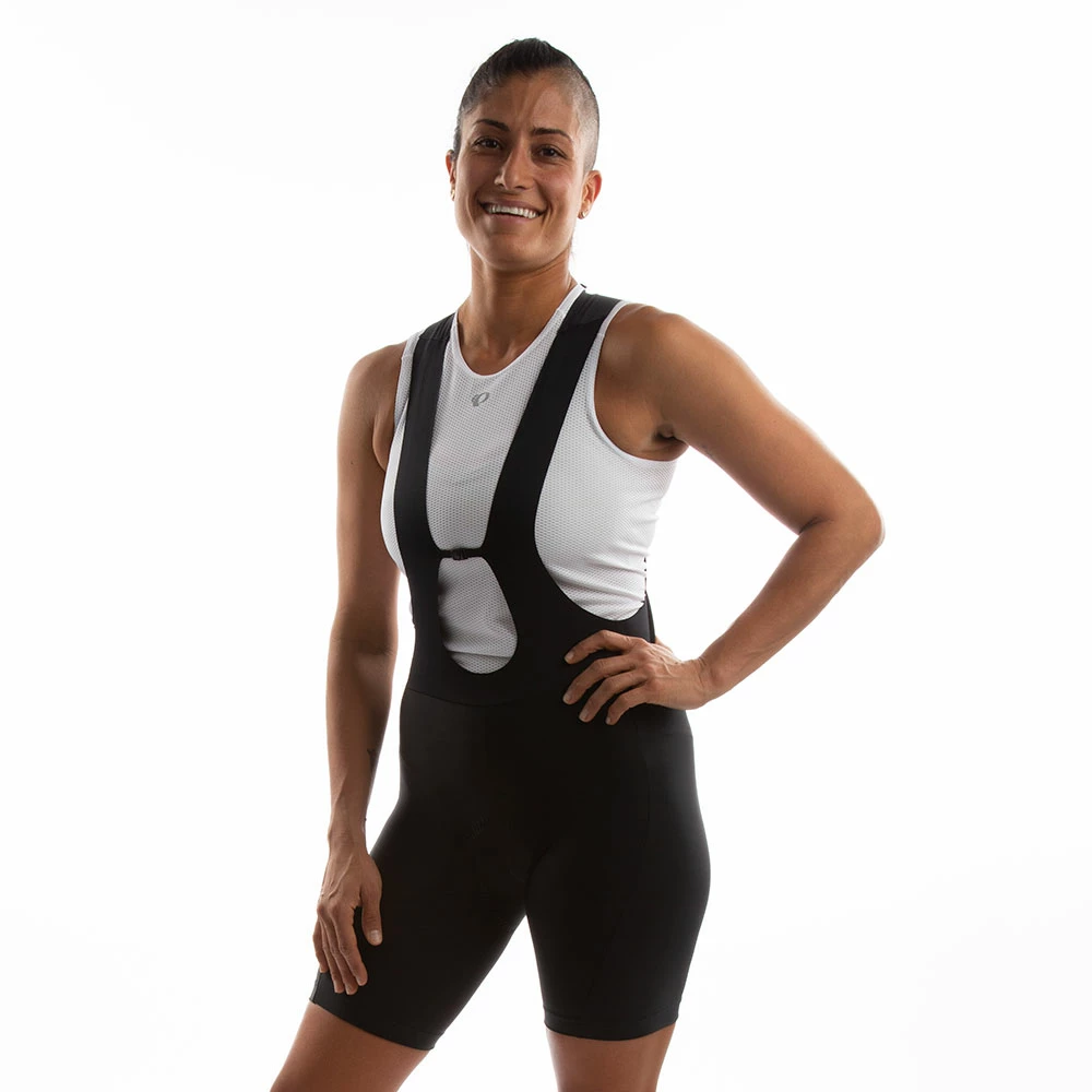 - Raw-edge bibs in transfer knit with compression effect and minimalist seams for improved comfort