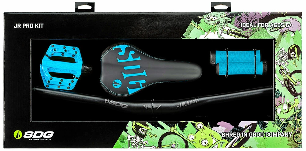 Le premier kit de mise à niveau tout-en-un avec des composants premium, optimisé ergonomiquement pour améliorer les performances et le contrôle ultime. Avec le kit Jr. Pro, SDG propose aux vététistes en herbe un kit pour mettre en valeur leur vélo sur le plan visuel.