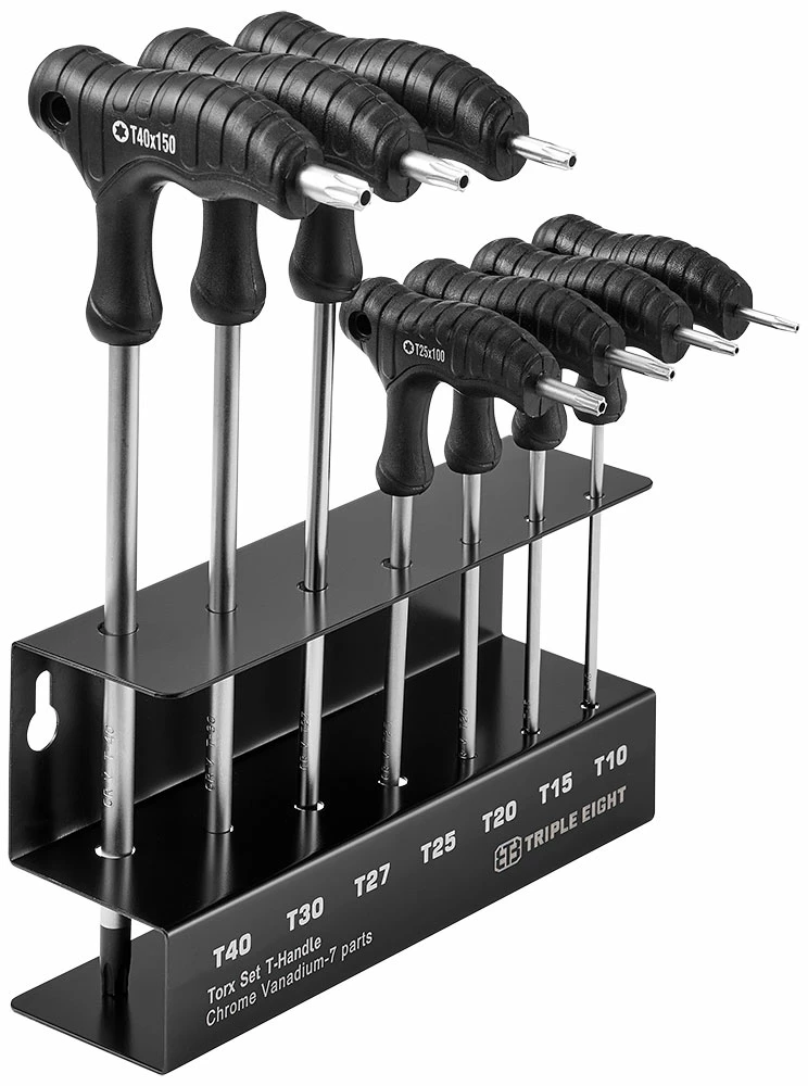 jeu de clés TRIPLE EIGHT de 7 pièces avec support mural pratique pour vis à six pans ronds avec poignée en T en thermoplastique.