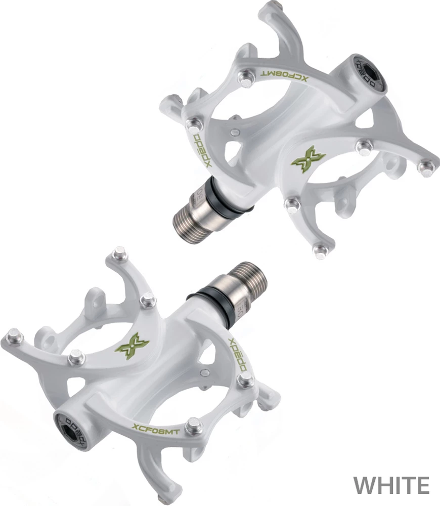 La pédale de plateforme Traverse 8 de Xpedo est extrêmement légère grâce à son corps en magnésium, mais aussi particulièrement robuste grâce à son axe en acier CroMo. Douze pins de chaque côté assurent une adhérence optimale à tout moment.